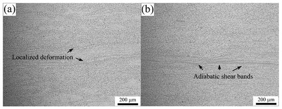 The typical microstructures in the instability regimes are also observed, as shown in Figure 17a,b. From Figure 17a, the microstructure corresponding to the condition of 1273 K/5 s−1 exhibits features of mixed grains caused by intensely centralized deformation during the hot compression. This is a typical form of localized flow which commonly causes large internal stress and facilitates crack initiation and propagation by further deformation [53], and thus is harmful to acquiring good mechanical properties. Moreover, the low power dissipation efficiency in this region also suggests that most of the plastic power input converts to heat and dissipates in the form of a temperature rise in the steel [36,46]. The microstructure of the steel deformed at a strain rate of 5 s−1 and temperature of 1473 K is shown in Figure 17b. It can be seen that the adiabatic shear bands consisting of numerous fine grains have been formed, which may be associated to cracks and cavity [54]. At high strain rates, the heat generated from the hot deformation conducted at high temperatures cannot escape timely and then the internal temperature rise is unavoidable. The local flow softening and local DRX are mainly responsible for these shear deformation bands. Hence, the identified instable regimes should be kept away during practical processing.