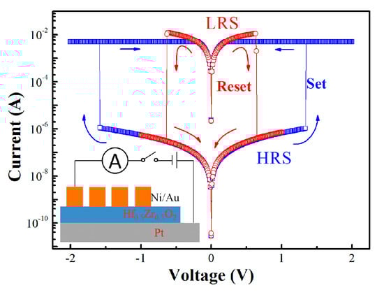 According to the analysis results given above, the switching of the initial HZO film to LRS is due to the forming process, which is accompanied by the soft breakdown. For the reset process, the resistance increased suddenly, which indicates that the filamentary conducting paths might have been ruptured. A joule heating effect caused by the external current is considered for the rupture of filaments. By increasing the voltage to Vreset, the high current flow through many filaments heated up the film, which induced a simultaneous rupture of the filaments, and the HRS was achieved. For the set process, because the sample is composed of stoichiometric ZrO2 and HfO2, it is impossible to form conducting filaments by oxygen vacancies (VOS). This suggests that some reactions might take place in the sample during the set process. It is reasonable to suggest that an oxygen-deficient region can be formed during the electroforming process. Transition metal cations accommodate this deficiency by trapping electrons injected from the cathodes []. In the case of HZO,