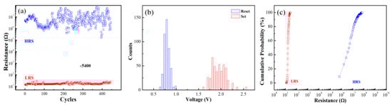 (a) Endurance characteristics of the H0.5Z0.5O2 (HZO) device; the currents are read at 0.2 V; (b) Set and Reset voltage distribution taken from the endurance cycles; (c) Distribution of the resistance at HRS and LRS taken from the endurance cycles.