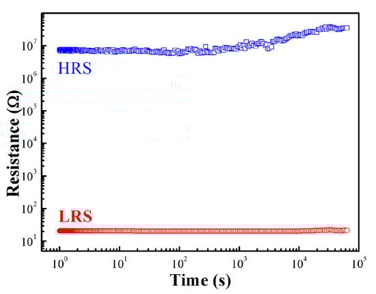 Figure 2a shows the endurance characteristic of the MIM structure with the resistance of HRS and LRS as a function of the number of switching cycles measured at the reading voltage of 0.2 V. During the progress of successive RS up to 450 cycles, the OFF/ON ratio was at least 5400 with no obvious degradation observed—an OFF/ON ratio of 10 is a sufficient separation for the nonvolatile memory application [], which means that our HZO sample is far beyond the basic requirement. Figure 2b demonstrates the distributions of Set/Reset voltage taken from the endurance cycles. The stander deviation of Set and Reset voltages are 0.17 and 0.06, respectively. Figure 2c shows the cumulative probability distribution of the resistance at LRS and HRS. As shown in Figure 2b,c, the HZO-based RS device demonstrates good uniformity. The retention property is another significant characteristic of the nonvolatile memory device [,], and demonstrates the ability of a device to retain information after writing the stored data. Figure 3 shows the retention characteristic of the HZO sample. During the stress progress, a small voltage of 0.2 V was applied to read the resistance state of the sample. The resistance of both HRS and LRS conditions showed no degradation over 6 × 104 s. All of these electrical properties indicate that the HZO thin film is an excellent RS material that has a high potential for RRAM application.