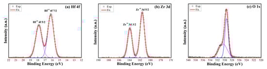 X-ray photoelectron spectroscopy (XPS) spectra of (a) Hf; (b) Zr; and (c) O in the original HZO sample.