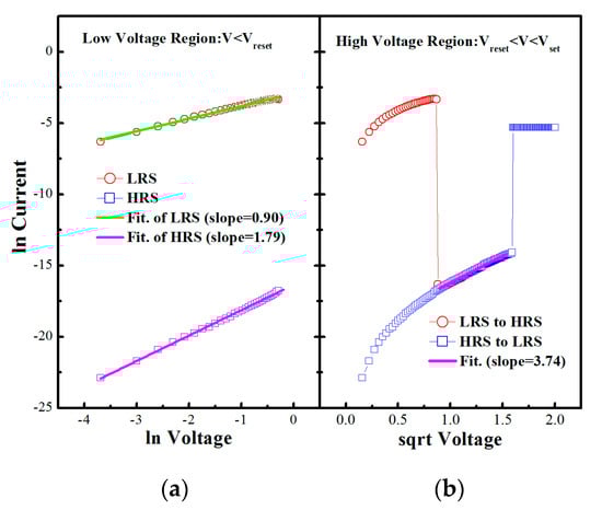 The typical current–voltage curves of the Au/Ni/HZO/Pt MIM structure in the low voltage region (V < Vreset) are plotted in log vs. log scale in Figure 5a. The current–voltage curves fitting for both LRS and HRS are straight lines, while a slope = 0.9 is present at LRS and slope = 1.79 is found at HRS. This indicates an ohmic conduction mechanism considered because of the formation of a conductive filament during the set procedure. However, for the HRS, the slope is approximately 2, which suggests that the conduction at HRS is presumably dominated by the trap control space charge limited conduction (SCLC) mechanism [].