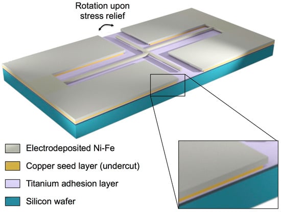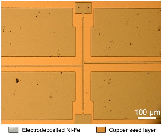 The thickness (2 ± 0.2 µm) and alloy composition (Fe contents of around 20% ± 5%) of the films were verified by means of X-ray fluorescence measurements. Once the electrodeposition is completed, the photoresist is stripped to expose the copper seed layer for wet etching (Figure 2e). Figure 3 shows a photograph of a test structure at this point in the process.