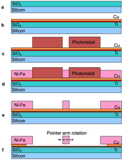 Fabrication process flow for the rotating pointer arm test structures: starting silicon substrate with protective silicon dioxide coating (a); sputter deposition of the titanium-copper seed layer stack (b); lithography to define the electroplated areas (c); electrodeposition of Ni-Fe through the photoresist mould (d); photoresist stripping and exposure of the copper seed layer (e); etching of the exposed copper seed layer and undercut etch underneath the pointer arm structures (f).