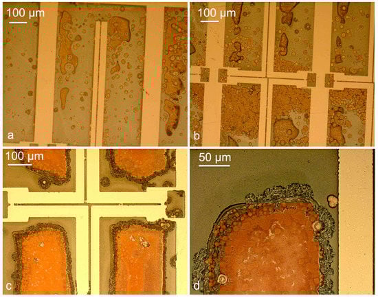 Micrographs of the test structures subject to copper etch with ammonium persulfate, at different etch times: 3 min (a); 5 min (b); and 10 min (c,d).