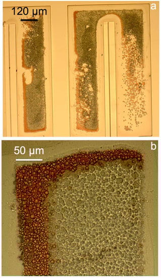 Micrographs of samples used for copper etch tests with ammonium persulfate in 1 M NaOH: overview of an anchor pad (a) and detail of the surface (b).