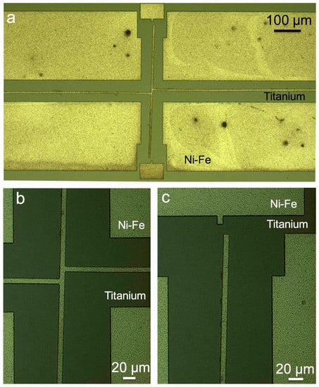 - Quemper, J.-M.; Nicolas, S.; Gilles, J.P.; Grandchamp, J.P.; Bosseboeuf, A.; Bourouina, T.; Dufour-Gergam, E. Permalloy electroplating through photoresist molds. Sens. Actuators A Phys. 1999, 74, 1–4. [Google Scholar] [CrossRef]
