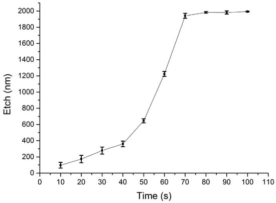The etch rate of the low-temperature SiO2 films in BOE 10:1 (10:1 ammonium fluoride (NH4F) and hydrofluoric acid (HF)) at room temperature was tested first. To this end, a solution of 100 mL BOE 10:1 diluted in 200 mL DI water was prepared. Test wafers coated with the blanket sacrificial SiO2 layer were immersed and left in the etchant for different times, with the etch duration increased in steps of 10 s. The residual film thickness was measured with a Nanospec 3000 reflectometer on each sample, and the results are shown in Figure 7.