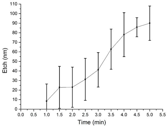 Etched thickness of sacrificial PECVD SiO2 in a solution of one part BOE 10:1 diluted in 10 parts DI water. Each measurement point is the average of five thickness measurements across the wafer surface.
