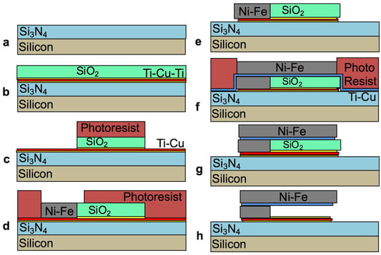 The starting substrate is a silicon wafer coated with a protective layer of 0.7 µm thick silicon dioxide (Figure 2a). The titanium and copper seed layer stack is then sputter deposited on the wafer in an OPT Plasmalab 400 magnetron sputtering system (Figure 2b). The copper serves as a seed layer for electroplating at a thickness of 300 nm to ensure good conductivity over the entire wafer area. The 30 nm thick titanium serves as adhesion layer between the copper and the underlying silicon dioxide insulator. Photolithography is then used to pattern the electroplating mould (Figure 2c). To this end, the wafer is first exposed to adhesion promoter hexamethyldisilazane (HMDS) at room temperature for 30 s, then Microchem MEGAPOSIT™ SPR™ 220-4.5 photoresist is dispensed and spun at 4000 rpm for 60 s, so as to obtain a thickness of about 4 µm. An edge bead removal (EBR) step is performed to ensure that the seed layer is exposed at edge of the wafer, as it will serve as contact for the electrodeposition process. The photoresist is then soft baked at 90 °C for 60 s. The wafer is placed in the mask aligner, operated in proximity mode, and exposed to a dose of about 350 mJ/cm2. The photoresist is post-exposure baked at 115 °C for 90 s, and then developed in MEGAPOSIT™ MF26A developer until all the exposed photoresist is dissolved. A ~2 µm thick Ni-Fe layer is then electrodeposited using a DC power source to provide a current density of 20 mA/cm2 (Figure 2d). The electroplating bath is composed of the chemicals reported in Table 1.