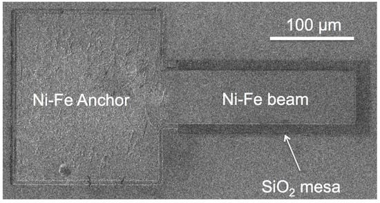 Test microcantilevers (200–300 µm long and 10–100 µm wide) were manufactured using low-stress electrodeposited Ni-Fe [,,]. A two-step electrodeposition technique was used to first deposit the cantilever anchor, followed by the cantilever beam. This two-stage process avoids the introduction of additional mechanical stress and stress gradients in ECD Ni-Fe [], enabling a clearer evaluation of the etch release. The sacrificial PECVD silicon dioxide reported in Section 3.1 was used to produce mesa structures that serve as a resting surface for the cantilever beams.