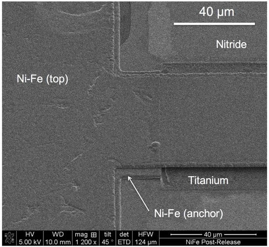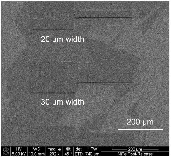 Moreover, when manufacturing MEMS devices with mechanically movable components such as microswitches and microactuators, surface micromachining is a key process that enables suspended and freestanding structures to be patterned and released []. To integrate moveable soft magnetic components based on ECD Ni-Fe in MEMS devices, it is necessary to develop robust sacrificial etch processes that preserve the integrity of the magnetic and other surrounding materials [,,,,]. The release of freestanding structures in MEMS is usually the last step in the manufacturing process flow before packaging, as suspended elements make the devices significantly more sensitive to failure when subject to further processing []. For this reason, surface micromachining processes are often performed on complete devices that already incorporate all functional elements. It is therefore crucial to ensure sufficient etch selectivity between the sacrificial material of choice and the combination of other structural materials employed as functional device elements. Additionally, complex architectures require the patterning of sacrificial layers prior to surface micromachining, in order to allow for further processing before the releasing step. Both the patterning and complete removal of sacrificial layers must therefore be fully compatible with Ni-Fe and the other structural materials.