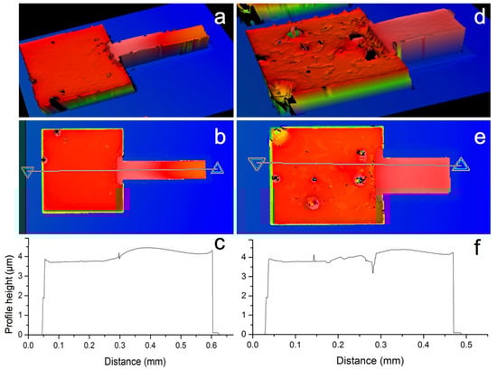 White light interferometry of two released cantilever beams: 300 µm long × 70 µm wide (a–c); and 200 µm long × 100 µm wide (d–f). 3D topology reconstructions (a,d); top views with the height measurement line (b,e); and measured profile height (c,f). Note the change in roughness between the pads (two electrodeposited layers stacked) and the beams (electrodeposited on a smooth sacrificial oxide mesa). Note that the surface roughness observed in (d) is due to the uneven growth of Ni-Fe, possibly associated to roughness of the underlying layer, current crowding effects due to topology defects, impurities, etc.