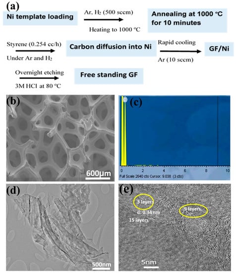 (a) A schematic showing the typical graphene foam (GF) formation process; (b) Scanning electron microscopy (SEM) image; (c) Energy dispersive X-ray spectrometry (EDS); and (d,e) Transmission electron microscopy (TEM) images, of GF.