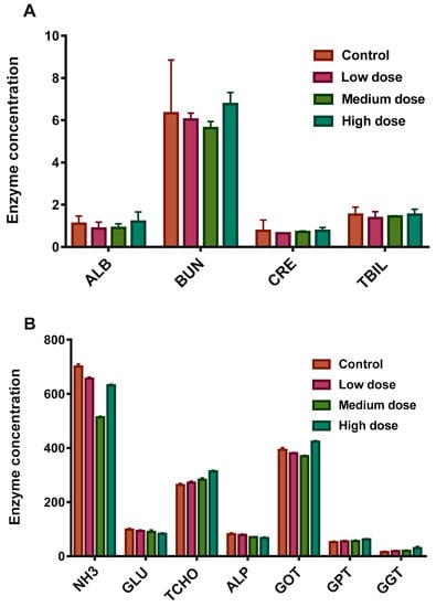 (A,B): Blood analysis of common carp exposed to GF as a function of dose level after 7 days. These results showed mean and standard deviations of ALB: albumin (d/dL), BUN: blood urea nitrogen (mg/dL), CRE: creatinine (mg/dL), TBIL: total bilirubin (mg/dL) and B: NH3: ammonia (μg/dL), GLU: glucose (mg/dL), TCHO: total cholesterol (mg/dL), ALP: alkaline phosphates (μ/L), GOT/AST: glutamic oxaloacetic transaminase/Aspartate Aminotranferse (μ/L), GPT/ALT: alanine aminotransferase (μ/L), GGT: ν-glutamyltransferase (μ/L), ALB: albumin (d/dL), BUN: blood urea nitrogen (mg/dL), CRE: creatinine (mg/dL), and TBIL: total bilirubin (mg/dL). Data are presented as mean ± SE (n = 3).