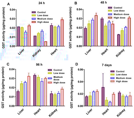 (A–D): Glutathione-S-transferase (GST) activity in different organs of the common carp exposed to various concentrations of GF for different times: (A) 24 h (B) 48 h (C) 96 h (D) 7 days. Data are presented as mean ± SE (n = 3).