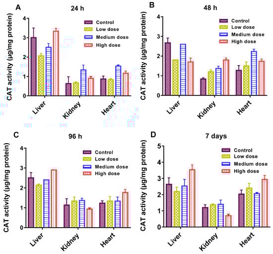 (A–D): catalase (CAT), activity in different organs of the common carp exposed to various concentrations of GF for different times: (A) 24 h (B) 48 h (C) 96 h (D) 7 days. Data are presented as mean ± SE (n = 3).
