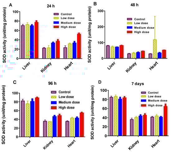 (A–D): Superoxide dismutase (SOD) activity in different organs of the common carp exposed to various concentrations of GF for different times: (A) 24 h (B) 48 h (C) 96 h (D) 7 days. Data are presented as mean ± SE (n = 3).