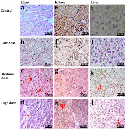 Histopathology of the heart, kidney, and liver of the common carp was also exploited and the results are shown in Figure 7 (in a dose dependent manner). Less damage was revealed in the low dose groups, but more damage was perceived in the high dose groups. Heart tissues showed normal histology in the control and low dose treated common carps (Figure 7a,b), whereas brown atrophy (