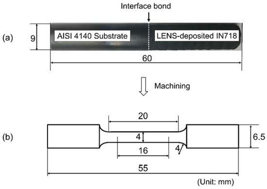 LENS of IN718 has been studied by researchers to investigate its microstructure and mechanical properties [15,16,17]. However, to date there has been no available research on LENS-deposited IN718 powders on AISI 4140 alloy steel substrates in the literature. No published literature was available on the interface bond and mechanical properties of a hybrid part which is made up of half-deposited material and half-substrate material. Joining two dissimilar materials with a good interfacial bond is critical to ensure the overall performance of the whole part, since low bond strength may lead to failure resulting from the coating peeling off, cracking, or corrosion along the interface [5]. The coated or repaired material will be functional only when the interface between the coating and the substrate is durable and strong [18].