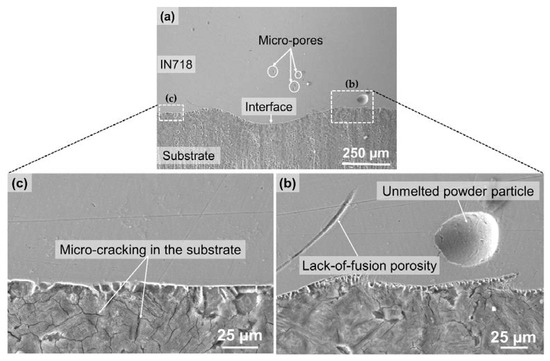 Metallurgical defects such as unmelted powder particle inclusion, micro pores, and lack-of-fusion porosity were observed in the laser-deposited IN718 part near the interface between the laser-deposited layers (Figure 3a,b), which are prevalent in laser-based additive manufacturing processes and have been widely reported in the literature [19,20,21]. These defects could reduce the density of the as-deposited part, resulting in lower tensile properties compared to the corresponding wrought material [22]. During the laser deposition process, the substrate near the interface and HAZ underwent micro-cracking along the grain boundary due to thermal stress caused by the steep thermal gradient between the high temperature melt pool and the chilled substrate, as well as the repeated heat cycles from the laser-deposited layers (Figure 3c).