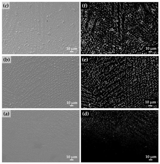 SEM images showing the morphology and concentration of the precipitation of as-deposited IN718 parts in different regions (a) bottom; (b) middle; and (c) upper area, and binary images showing the matrix as black background and precipitation as white particles in (d) bottom; (e) middle; and (f) upper area, corresponding to a–c, respectively.