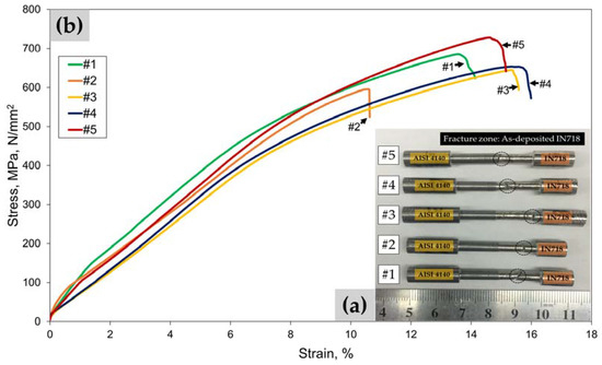 All fractured hybrid tensile specimens obtained after the tensile test at room temperature are illustrated with the corresponding tensile stress-strain curves in Figure 5. The left side of the specimen is made of AISI 4140 alloy steel substrate, and the right side of the specimen is made of as-deposited IN718 (Figure 5a). All the specimens failed within the as-deposited IN718 region. No fracture failure was detected on the substrate or the interface, indicating that the as-deposited part of the hybrid specimen is weaker than the AISI 4140 substrate and the interface. Therefore, it can be concluded that the interface bond strength between the AISI 4140 substrate and the as-deposited IN718 is higher than the bond strength between the successive layers of the as-deposited IN718.
