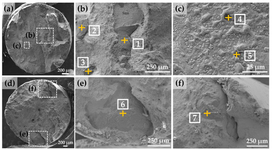 Figure 9a,d show the morphology of the oxide films on the entire fracture surface of specimens #2 and #4, respectively. Figure 9b,c,e,f reveal high magnification of the corresponding oxides from the dotted areas of specimens #2 and #4, respectively. These were clearly distinguished from the matrix, which appear dark in secondary electron (SE) mode.
