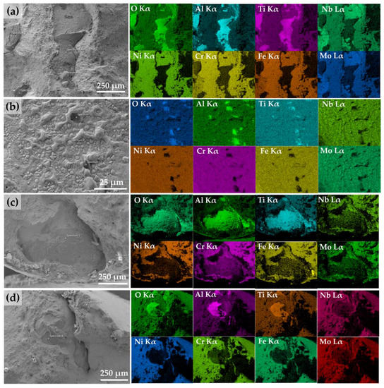 EDS element mapping in the selected regions from Figure 9b,c,e,f revealed that O, Al, and Ti were highly concentrated, but Ni, Fe, Cr, Nb, and Mo were depleted in the dark phases, as shown in Figure 10a–d.