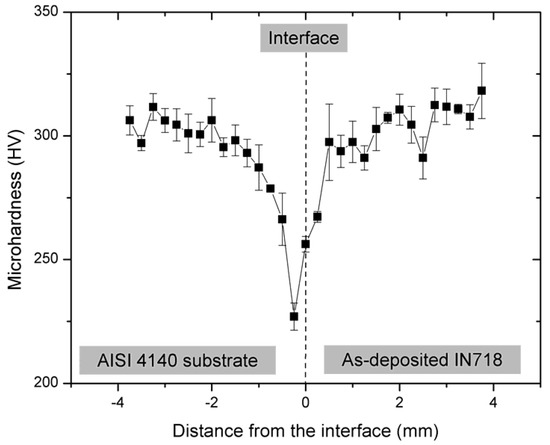 The average Vickers microhardness profile on the cross-sectional hybrid specimen including the AISI 4140 substrate, interface, and as-deposited IN718 is shown in Figure 11. The average microhardness of the as-deposited IN718 (301.6 ± 13 HV) was higher than that of the substrate (292.0 ± 21 HV). There was a sharp decrease in microhardness near the interface in the substrate, which showed the lowest microhardness (226.9 ± 5 HV) at the HAZ below the interface. This was attributed to microstructural changes and micro-cracks as a result of subsequent heat transfer from the laser-deposited layers due to the repeated heat cycles and thermal stress, as illustrated in Figure 3c.