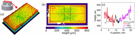 The distortion angles of the bridge-shaped specimens [16] were measured at their top surfaces with the ZEISS LSM 700 confocal microscope (Figure 1). Incidentally, this can be used for a fast assessment of the trends of residual stress state in SLM samples. For the released specimens (R), the bottom facets were also measured. Distortion angles were computed by averaging the angles measured in two rectangular regions towards the edges of the bridges along the longitudinal axis (Figure 1b). Each angle was calculated from the slopes m1 and m2, respectively (Figure 1c). This procedure was repeated for each line parallel to the X axis, yielding the deflection angle as a function of the Z-coordinate. From this, the average over around 800 lines was taken, and the mean deflection angle α of the bridge and the standard deviation were calculated.