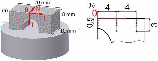 (a) Schematic representation of a bridge sample and its dimensions (T—transversal, L—longitudinal, N—normal); (b) specification of mapped area by synchrotron diffraction and specific points measured on the lateral surface.