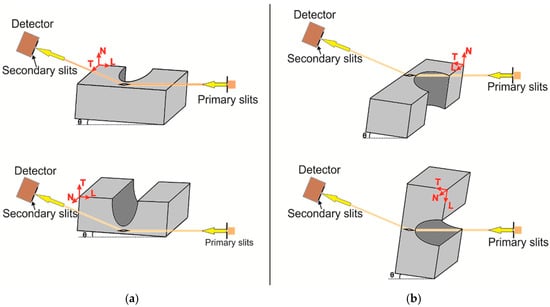 Sketch of residual stress measurement by sin2 ψ in reflection set-up for (a) transversal strain component; (b) longitudinal strain component (References system: L stands for longitudinal, T for transversal, N for normal components).
