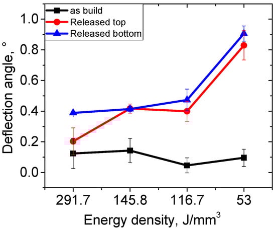 A first assessment of the residual stress in the SLM samples as a function of the process energy density (EV) is obtained from distortion angle measurements in the released bridge specimens. It discloses that the deformations strongly increase for EV < 116 J/mm3, i.e., scanning velocities exceeding 500 mm/s (Figure 4). The deflection angle was measured at the top and bottom surfaces of the bridge specimens, after removing them from the baseplates by means of spark erosion. Apparently, for sufficiently high EV (smaller laser scan velocities) such as those used for the samples A3 and A4, the distortion angles are similar. Prior to release from the baseplate (as-built condition), none of the samples showed any deformation within the accuracy of the measurement, and the obtained geometries retained their near-net shape. Using SLM process parameters close to the ones corresponding to EV = 116.7 J/mm3, may provide a processing window with comparably low distortion angles (Figure 4), while at EV much lower than ~53 J/mm3, highly distorted samples were obtained in a significantly different material state. Residual stress measurements were conducted for SLM parameters A4 (optimum window) and A10 (above the optimum window).