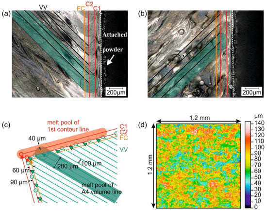 (a) Light optical microscopy image of sample A4 (with scan vectors and melt track width marked (C1, C2: first and second contour line; FC: fill contour; VV volume vector); (b) light optical microscopy image of A10 with scan vectors and melt track width marked; (c) schematic view of the scan strategy in the wall region showing contour, fill contour, and bulk laser vectors; (d) roughness map of the lateral surface of sample A4 (Ev = 116.7 J/mm3).