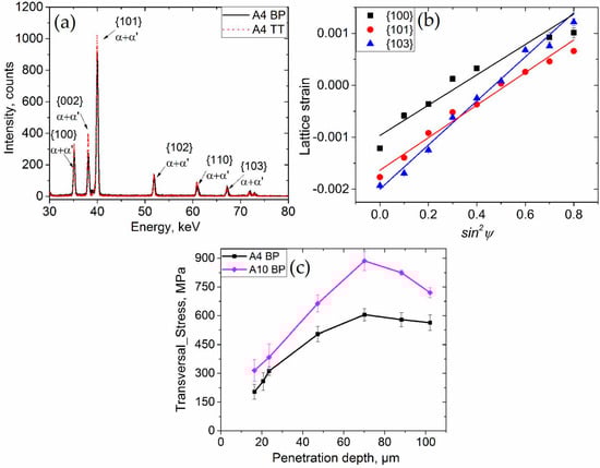 (a) Diffractograms for samples with the baseplate (BP) and after thermal treatment (TT); (b) example of sin2 ψ data evaluation for A4 BP (L = 4, T = 0.5); (c) transversal component of residual stress profile as a function of depth for samples with BP.