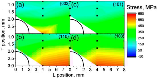 Transversal residual stress maps for different crystallograpic planes for condition A4 BP (a) {002}; (b) {110}; (c) {101} and (d) {103}. The black line in the left bottom corner indicates the opening of the bridge with the pillar to the right. The average error is ±30 MPa.
