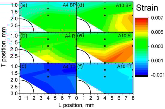 Lattice strain maps of crystallographic plane {103} in the T direction (building direction) for process conditions A4 (a; BP) with baseplate, (b; R) released, (c; TT) after thermal treatment and A10 (d; BP) with baseplate, (e; R) released, (f; TT) after thermal treatment. The average error is ±4 × 10−4.