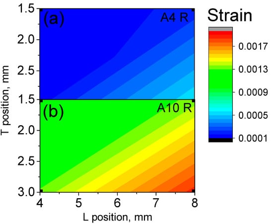 In the case of samples A4 R and A10 R, it was also possible to characterize the longitudinal component of the lattice strains (Figure 9). The average error of the longitudinal lattice strain was around ±3 × 10−4. It must be noted that, due to the elongation of the gauge volume, the middle-top part above the arc was not measured and only the results for the pillar region are reported (Figure 2 and Figure 3b).