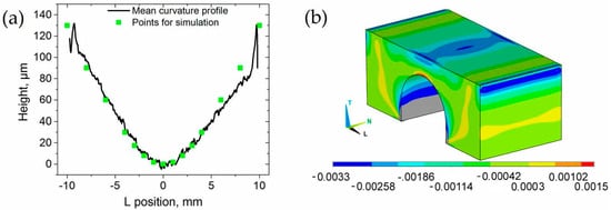 (a) Mean curvature profile of A10 specimen with marked data points used for a FE-simulation; (b) transversal elastic strain resulting from the simulation in 3D (initial state: deformed top surface; end state: flattened top surface).