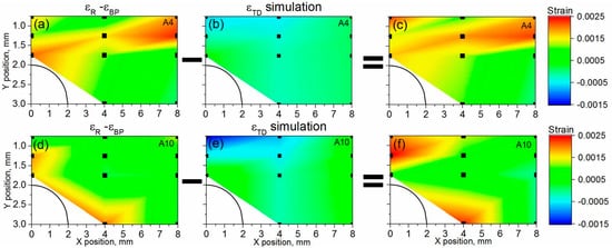 Strain maps for sample A4: (a) experimental free distortion component; (b) simulated free distortion component; (c) the difference between experimental and simulated free distortion; for sample A10; (d) experimental free distortion component; (e) simulated free distortion component; (f) the difference between experimental and simulated free distortion. The average error for experimental data is around ±4 × 10−4.