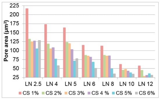 Radial heterogeneity occurs because of the occurrence of two opposite features. On the one hand, the use of a fast immersion rate further approaches the supercooled regime and even smaller ice crystals (than for dipping rates of 2.7 mm·min−1) are formed. On the other hand, and taking into account the low heat capacity and thermal conductivity (latent heat) of liquid nitrogen, there is a limit to the sample mass that nitrogen is capable of supercooling. Above that limit, a nitrogen vapour barrier is formed around the sample (e.g., the Leidenfrost effect), restricting the rate at which heat is withdrawn from the sample and determining the formation of large ice crystals at the outer shell of the monolith. Moreover, the channel size was not only dependent on the immersion rate, but also on the type of CNTs. We then fixed the immersion rate at 5.9 mm·min−1 and studied the effect of CS and MWCNT concentration on tailoring scaffold morphology. For low MWCNT contents (ca. 2.5–4 wt %), SEM images (Figure 3) revealed the formation of a layered architecture in the form of poorly interconnected CS sheets arranged in parallel layers. The increase of the MWCNT content (ca. 6 wt %) favoured the formation of pillars crossing between layers, fully interconnecting the 3D structure. Additionally, the size of the porous channels was scaled down, a consequence of the increased difficulty for the ice crystals to form in the presence of CNTs. A further increase of the MWCNT content resulted in structures where the porous channels are almost closed; that is, we hypothesised that the MWCNT content reached values that favour the formation of amorphous (supercooled water) rather than crystalline ice, so that no segregation of matter occurred []. SEM images of SN/CS scaffolds revealed similar structural features than those observed for LN/CS scaffolds, demonstrating than CNT concentration had a larger impact on porosity than CNT size. Interestingly, we have also observed the capability of forming macroporous structures upon freezing when the SN content in the aqueous solution is as high as ca. 18 wt % (Figure S4). The above-mentioned results reveal that the MWCNT content indeed modifies the morphology of the CS macrostructure (Figure 4). Moreover, the CS content also played a similar role as the MWCNT content in the resulting structure, with pore sizes that decreased with the CS content (Figure 4).