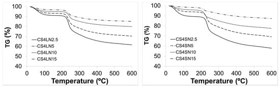 The thermal stability of scaffolds was assessed by TGA analysis. Scaffold weight loss in percentage (%) is plotted in relation to temperature treatment (Figure 5). For MWCNT/CS scaffolds, two-stage TG curves were observed. The first one started at around 41 °C and reached a maximum at ca. 92 °C, assigned to the loss of water. The second stage started at around 196 °C and reached a maximum at 252 °C, corresponding to the decomposition (thermal and oxidative) of CS and vaporization and elimination of volatile products. In this graph, CS weight loss was observed at ca. 229 °C which corresponds to CS moieties (Figure S5) []. The weight losses agreed with the CS contents of the different scaffolds.