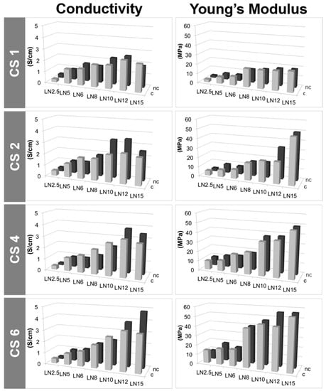 Conductivity and Young’s modulus values of LN-composed MWCNT/CS scaffolds prepared with different concentrations of LN and CS, and either cross-linked (c) or non-cross-linked (nc).