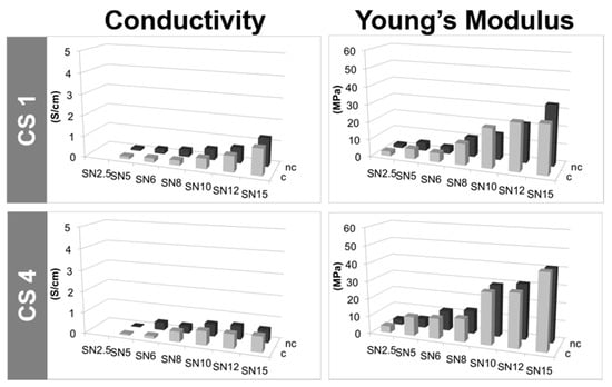 Conductivity and Young’s modulus values of SN-composed MWCNT/CS scaffolds prepared with different concentrations of SN and CS, and either cross-linked (c) or non-cross-linked (nc).