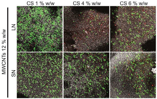 Finally, we carried out preliminary biocompatibility studies in vitro with human osteoblast-like Saos-2 cells to explore the potential use of these 3D porous structures as platforms for guiding cell growth. Figure 8 shows some representative fluorescence images of cells cultured on scaffolds varying the CS content for a fixed MWCNT concentration (12% w/w). Cell viability (indicated by the ratio of alive cells—in green- with respect to the dead ones—in red-) decreased in scaffolds with higher CS contents (e.g., 4 and 6 wt %). On the contrary, cell viability increased in scaffolds prepared with SN as compared to those prepared with LN, most likely due to already-observed cytocompatibility benefits of short MWCNTs []. Micrographs also showed how cells successfully spread on and colonize the scaffolds surface. Cell infiltration within the internal macropores was not observed in any case, most likely hampered by the limited exchange of nutrients and waste products between the outer and the inner parts of the scaffolds.