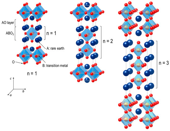 Ruddlesden–Popper (RP) oxides have shown very attractive and versatile physical properties such as superconductivity [35,36,37,38], magnetoresistance [39,40,41], and mixed ionic and electronic conductivity [42,43,44,45,46], which are beneficial for many energy and electronic devices. The general formula of RP phases can be written as An+1BnO3n+1 (n ≥ 1) [47]. The RP phases comprise n consecutive perovskite layers (ABO3) alternating with rock-salt layers (AO) along the crystallographic c-axis direction. Their formula can be represented by (AO)·(ABO3)n, where n represents the number of connected layers of vertex-sharing BO6 octahedra [48]. Figure 1 presents the ideal tetragonal unit-cells for n = 1, 2, and 3, which correspond to the stoichiometric compounds with the same space group, I4/mmm. For n > 1, the additional ABO3 blocks are introduced between two AO rock-salt layers. Commonly, these materials consist of rare or alkaline earth A-site cations with transition metals on the B site, forming an extensive series of compositions. The A-site cations have a coordination number of 9, locating at the boundary between the two types of layers, while the B-site cations are positioned at the center of an octahedron formed by six oxygen anions. Similar to ABO3 perovskite oxides, the RP phases show a rather high structural flexibility in the oxygen stoichiometry.