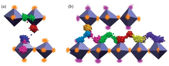 (a) 3D representation of oxygen vacancy migration between equatorial and apical positions within a CoO6 octahedron (pink and red), between equatorial positions (green) and between apical positions belonging to separate layers (blue) in La10.8Sr1.2CoO3.9; (b) 3D representation of oxygen interstitial migration in La1.2Sr0.8CoO4.1. Each oxygen involved in the migration event is represented by a different color. Spheres of the same color indicate the positions occupied by a specific atom over the simulation time. Reprinted from Ref. [79] with permission of The Royal Society of Chemistry.