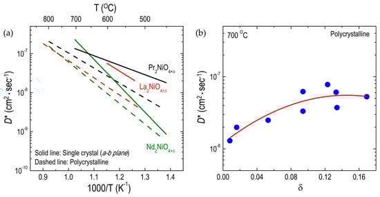 Arrhenius plots of oxygen tracer diffusivity (D*) for different RP oxides: (a) Effect of A-site substitutions on D* for A2NiO4+δ (A = Pr, La, and Nd) single crystalline and polycrystalline oxides: single crystal (Ref. [49,97]) and polycrystalline (Ref. [51]); (b) Dependences of D* on the oxygen nonstoichiometry in A2NiO4+δ (A = Pr, La, and Nd) polycrystalline oxides (Ref. [51]).