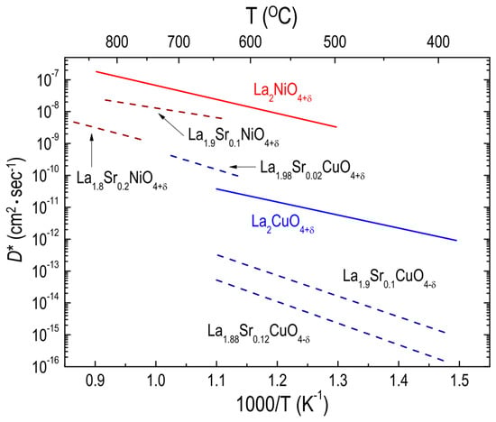 Arrhenius plots of oxygen tracer diffusivity (D*) for different RP oxides. Effect of Sr substitution on the A site on D* for La2−xSrxCuO4+δ (Ref. [56]) single crystal and La2−xSrxNiO4+δ (Ref. [51]) polycrystalline oxides.